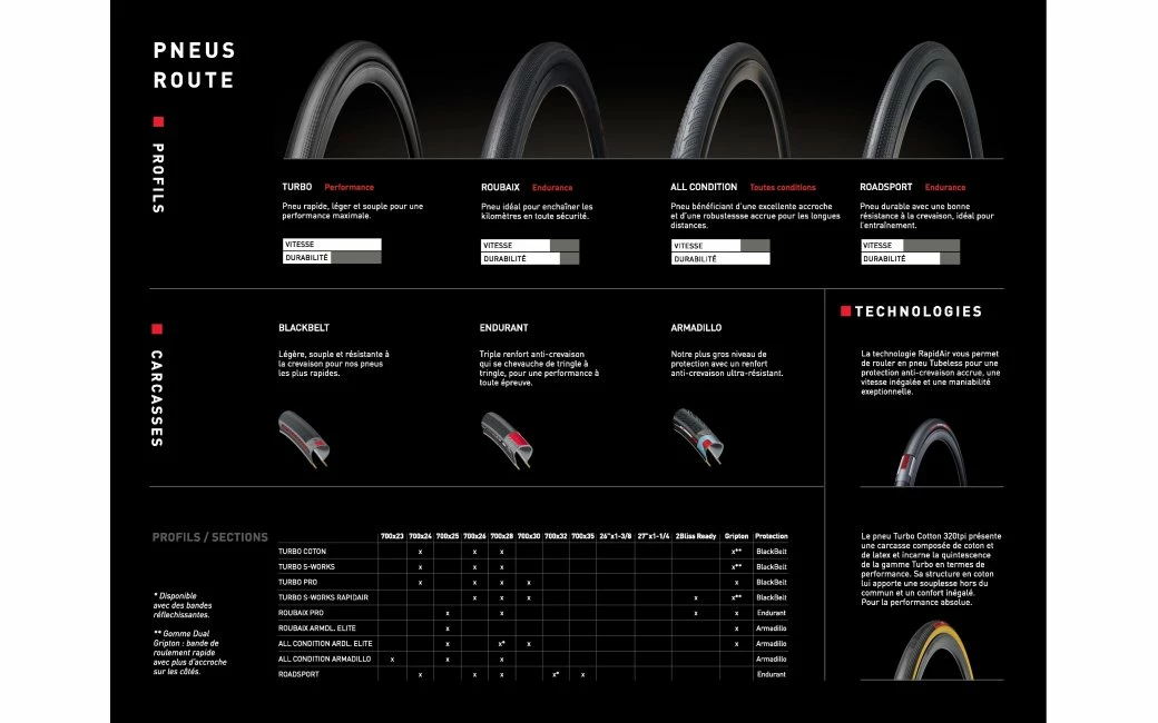 Le pneu S-Works Turbo redéfinit la notion de performances d’un pneu de compétition Route. Rapide, léger et souple, le Turbo S-Works est composé de notre gomme GRIPTON® offrant une faible résistance au roulement et une tenue en courbe exceptionnelle ayant permis de gagner les Championnats du Monde sur une route détrempée. Il demande moins d’efforts en montée, descend plus vite et tourne de façon agressive, le pneu idéal pour les cyclistes intransigeants.