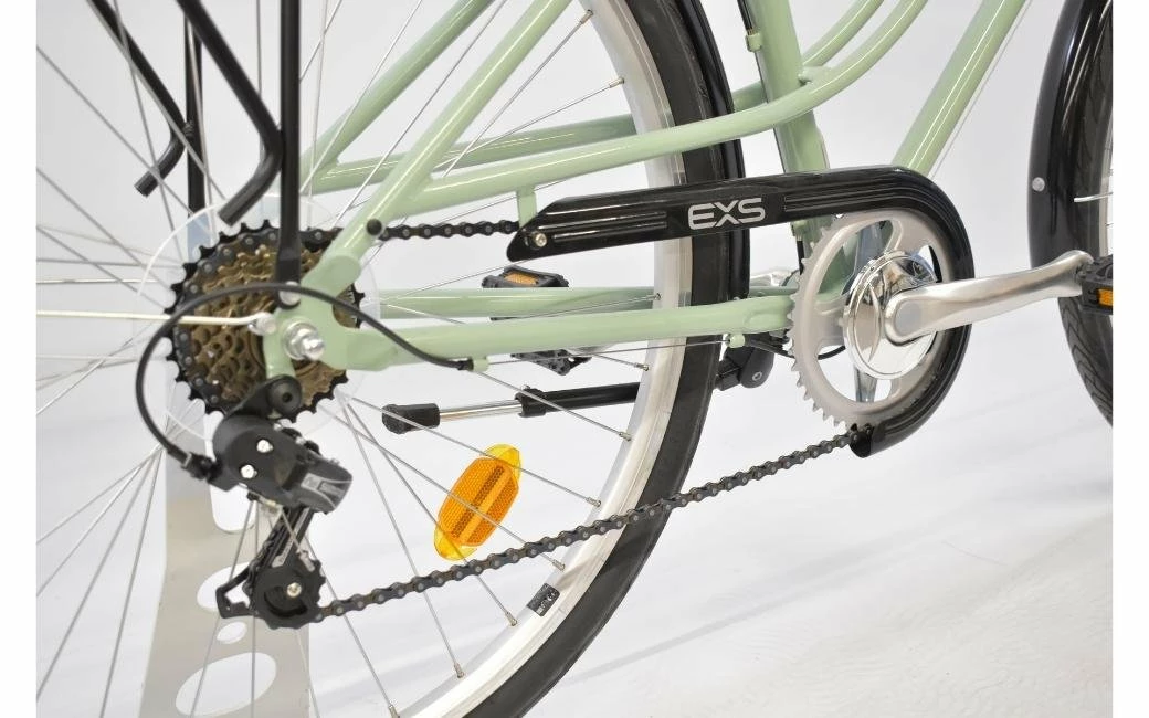 Le Sunset de chez EXS est un vélo de ville au design vintage chic. Ses roues de 26 pouces, le cadre ouvert vous permet d’avoir une conduite souple et dynamique. Il est équipé d’un porte-bagages, de garde-boues et d’un carter de chaîne de la même couleur que celle du cadre. Il a des poignées et une selle marron.