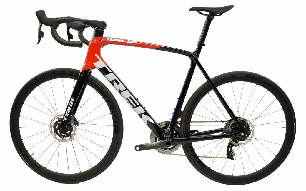 Le TREK Emonda SLR 7 eTap, son cadre carbone, une transmission SRAM en 12 vitesses, ses roues en 700c et ses freins à disque hydrauliques.