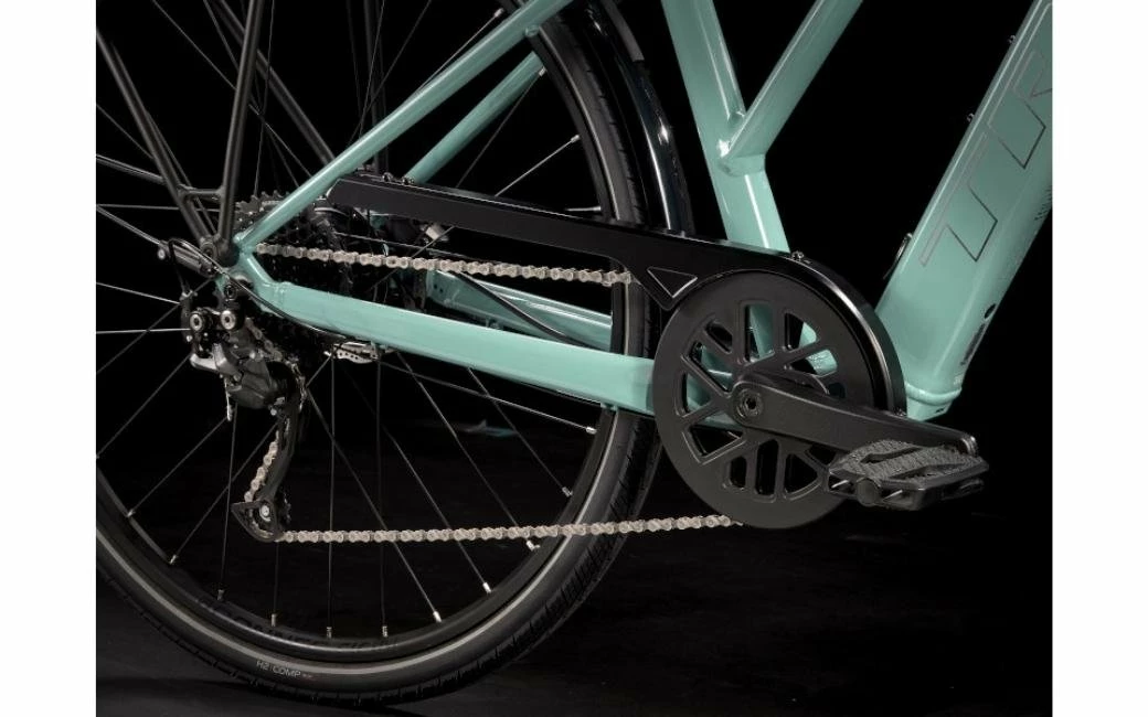 Un cadre ouvert léger en aluminium qui permet de monter et descendre facilement du vélo, le système d’assistance au pédalage exclusif de Trek doté d’un moteur-moyeu (250 W, 40 Nm) offrant une assistance allant jusqu’à 25 km/h et une batterie de 250 Wh pour une autonomie sur une distance allant jusqu’à 56 kilomètres par charge. Il est également doté de roues rapides 700c, de pneus rapides et stables 40c à flancs réfléchissants, d’une transmission Shimano fiable à 9 vitesses, de freins à disque hydrauliques, d’éclairages intégrés alimentés par la batterie, d’un porte-bagages arrière compatible MIK, de garde-boue et d’une béquille.